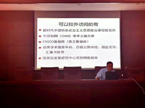 图书馆咨询部黄廷博老师又向各位参会教师简要介绍了图书馆内的资源分布及馆藏特色,并着重说明了各个电子数据库的校外访问方式,为各位教师的科研工作提供便利。