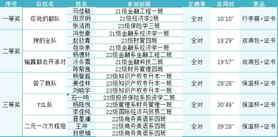 此次比赛,旨在激发师生读书热情,在比赛中熟悉馆藏分布、了解图书分类法和利用RFID智慧图书管理系统的检索技巧。共有20支代表队的60名选手参赛,每队三名选手累计用时最短的队伍获胜。通过团队协作和速度比拼,最后,马佳毓、田双玥、张洁雨三位选手组成的队伍获得第一名。具体获奖名单如下: