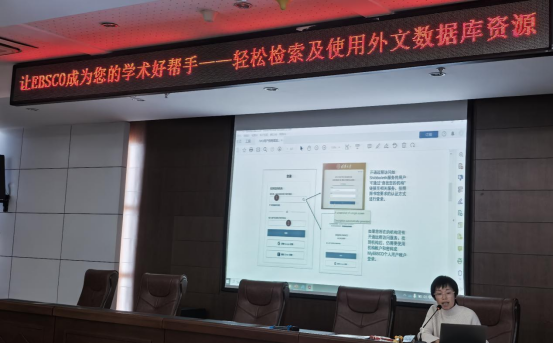 培训中,EBSCO数据库资深培训师王成芳从数据库资源介绍、ASP综合学科参考类全文数据库及BSP商管财经类全文数据库着重点的差异及数据库资源查找利用等多方面为师生做了详细讲演。互动环节,王成芳老师耐心解答了老师们提出的各种问题,包括如何跨越语言障碍、如何提高检索效率等。
