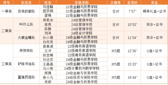 通过团队协作和速度比拼,马佳毓、田双玥、邵琦组成的代表队伍以累计用时最短获得第一名。具体获奖名单如下: