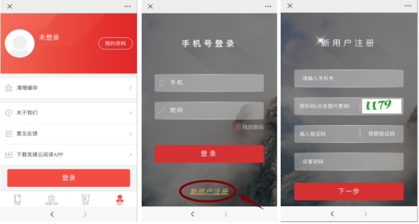 关注“哈尔滨金融学院图书馆”微信公众号,点击下方菜单栏【资源】-【党建云】进入数据库首页,新用户需要通过手机号注册,设置个人密码。