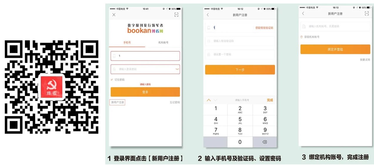 微信扫码或通过 http://download.bookan.com.cn/p/party 下载安装“博看党建云阅读”,首次登陆需要通过手机号注册,设置个人密码,绑定机构账号hrbfu,完成注册。