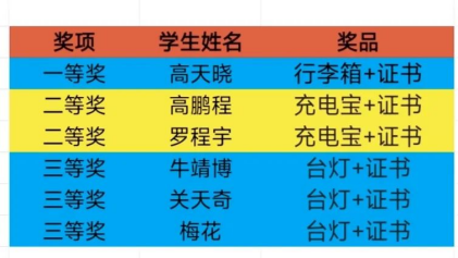 本次活动根据答题积分排名,评出一等奖1名,二等奖2名,三等奖3名。现将获奖名单公布如下: