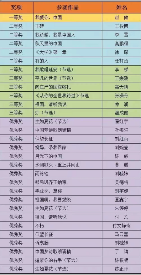 本次活动根据作品投票数和专业老师听审打分评出一等奖1名,二等奖5名,三等奖6名,优秀奖18名,现将获奖名单公布如下:
