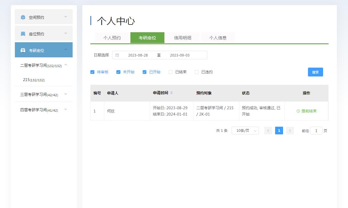 7.查看预约信息:点击个人中心——考研座位——显示当前用户的预约信息。