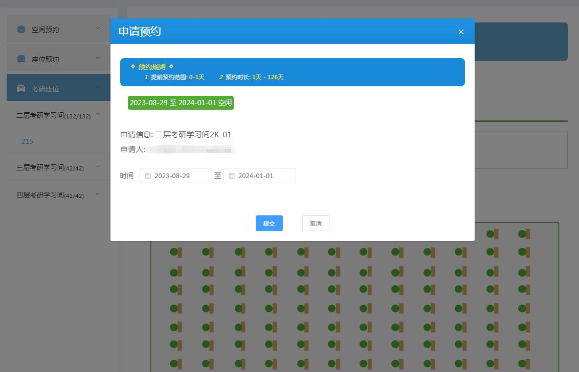 5.在弹出的界面中会显示选择预约的座位、申请人、申请日期、时间段(预约一次使用一学期),如下图: