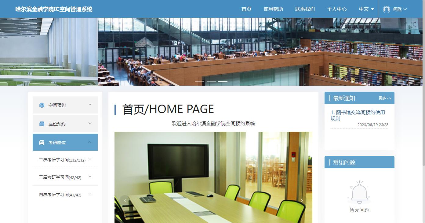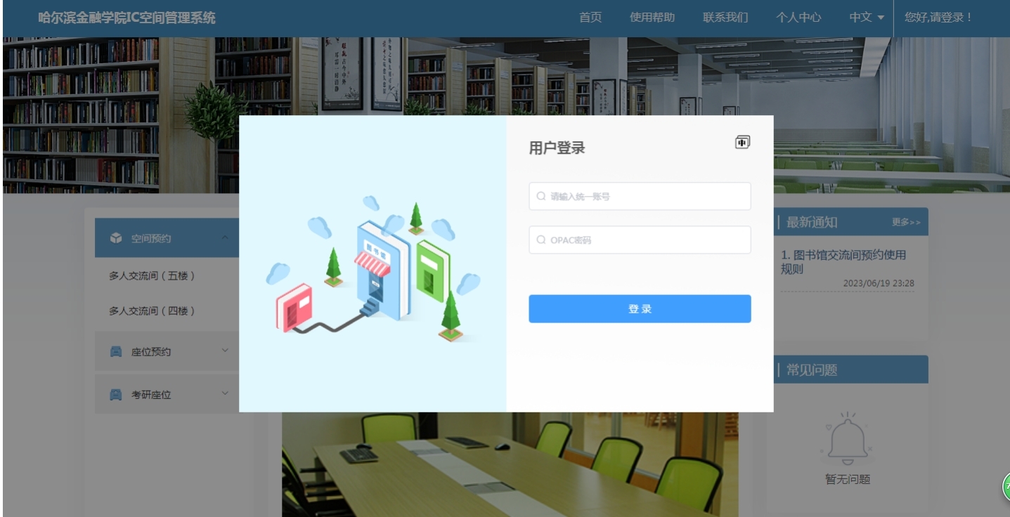 1.连接学校内部网络(非手机移动数据,非手机热点),打开电脑浏览器,进入哈尔滨金融学院图书馆网站,点击页面下方“空间预约”;或前往图书馆二楼大厅查询台点击“座位、研讨室预约管理系统”;或在电子阅览室输入网址172.16.15.22,页面如下: