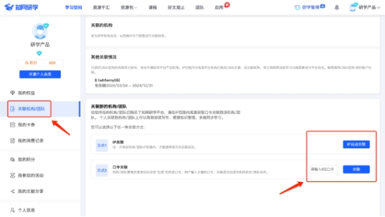 注册登录后,进入“个人中心-关联机构/团队”,在IP范围内,点击IP自动关联。
