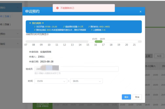 (6) 在弹出界面中蓝色区域可以看到研讨间预约的规则,根据提示填写内容,特别是组成员一栏,要添加全部小组成员,系统自动显示出的成员即为该组组长。