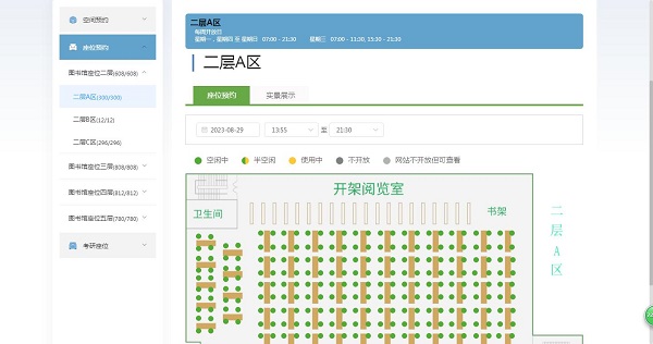 (4) 小圆点代表座位,选择上面的日期时间,下面座位校园点会根据预约的情况显示不同颜色。然后点击要预约的座位。