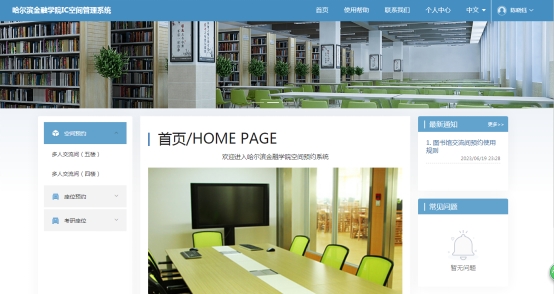 (1) 连接学校内部网络(非手机移动数据,非手机热点),打开电脑浏览器,进入哈尔滨金融学院图书馆网址https://tsg.hrbfu.edu.cn后点击页面下方空间预约,登录预约端(或前往图书馆二楼大厅内查询台),页面如下。