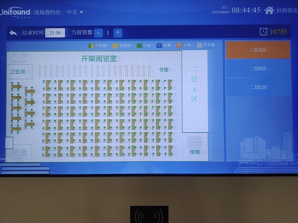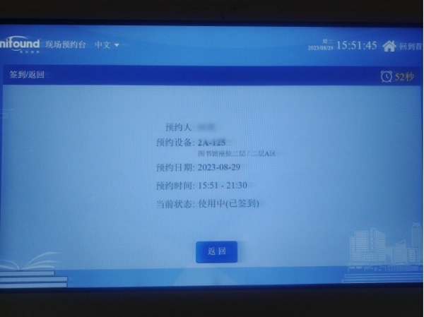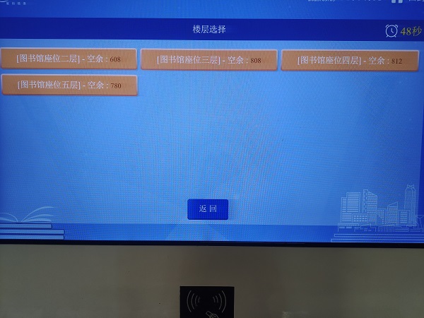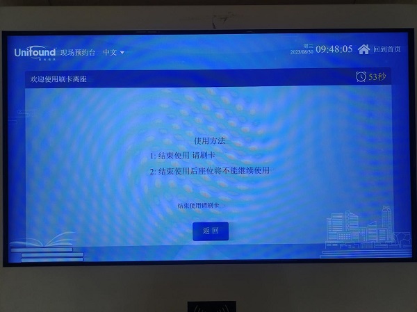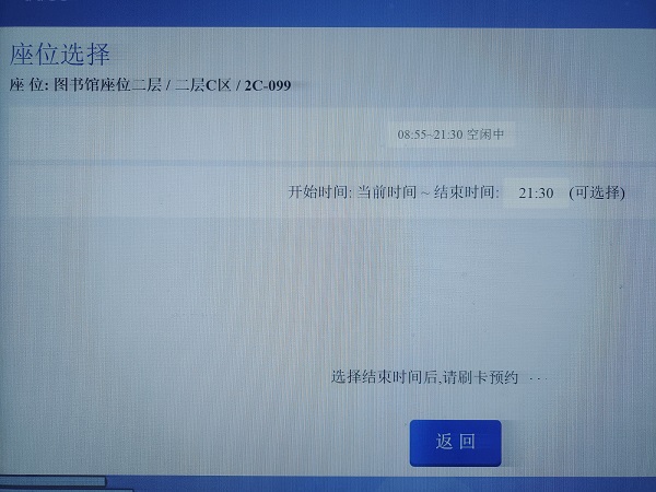 (5) 当前界面可以返回重新选择座位,也可以点击结束时间重新选择结束时间,全部信息确认无误后,刷卡预约