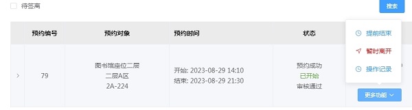 (8) 暂离和返回:在此页面中,点击更多功能,选择暂时离开。可暂时离开座位30分钟,再次回到座位前需要重新在馆内二楼或四楼预约台设备-查看预约或现场预约-现场选座中进行暂离返回签到后,方可继续使用。