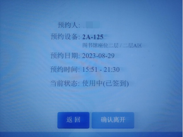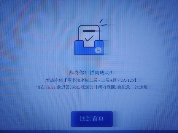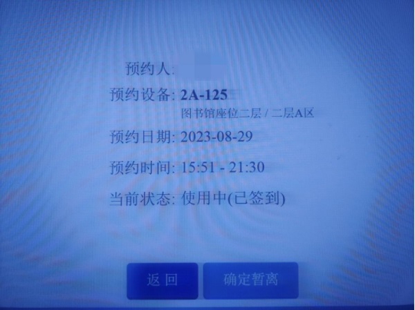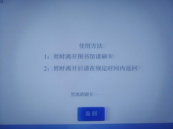 (12) 暂离返回。用户暂时离开后,在规定的时候内返回,刷卡后会显示暂离的座位信息以及暂离剩余的时间。然后点击右下角暂离返回,提示暂时离开返回成功。