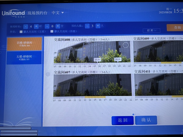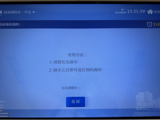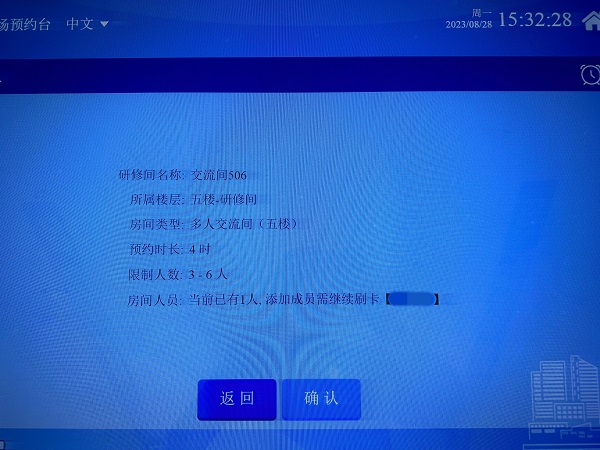 (4) 选择成功后,所有的小组成员均需要在设备上进行刷卡签到。待全部小组成员信息录入完毕后,点击确认,才可在所选时间内使用相应研讨间,在研讨间门口的PAD屏上刷卡进入。