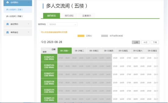 (4) 右边主界面会显示该空间类型下面所有研讨间的开放时间和预约信息。这是一个多维度的显示。左边列显示的是研讨间、上面行可以选择日期、在上面按钮可以切换。