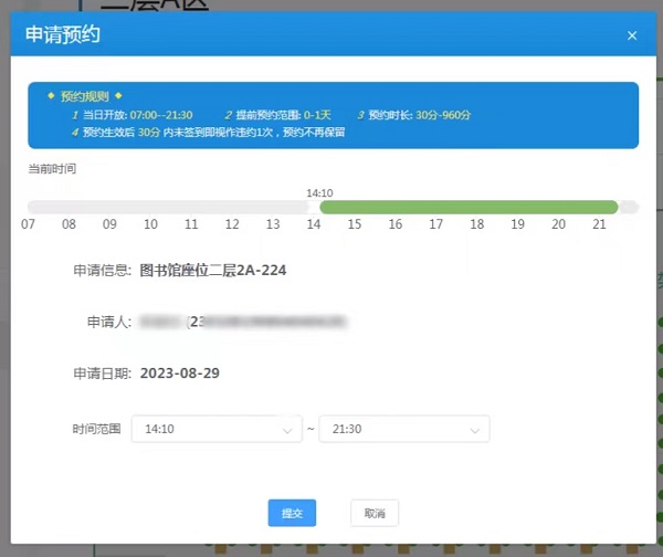 (6) 点击提交,然后提示预约成功,表示座位预约成功。